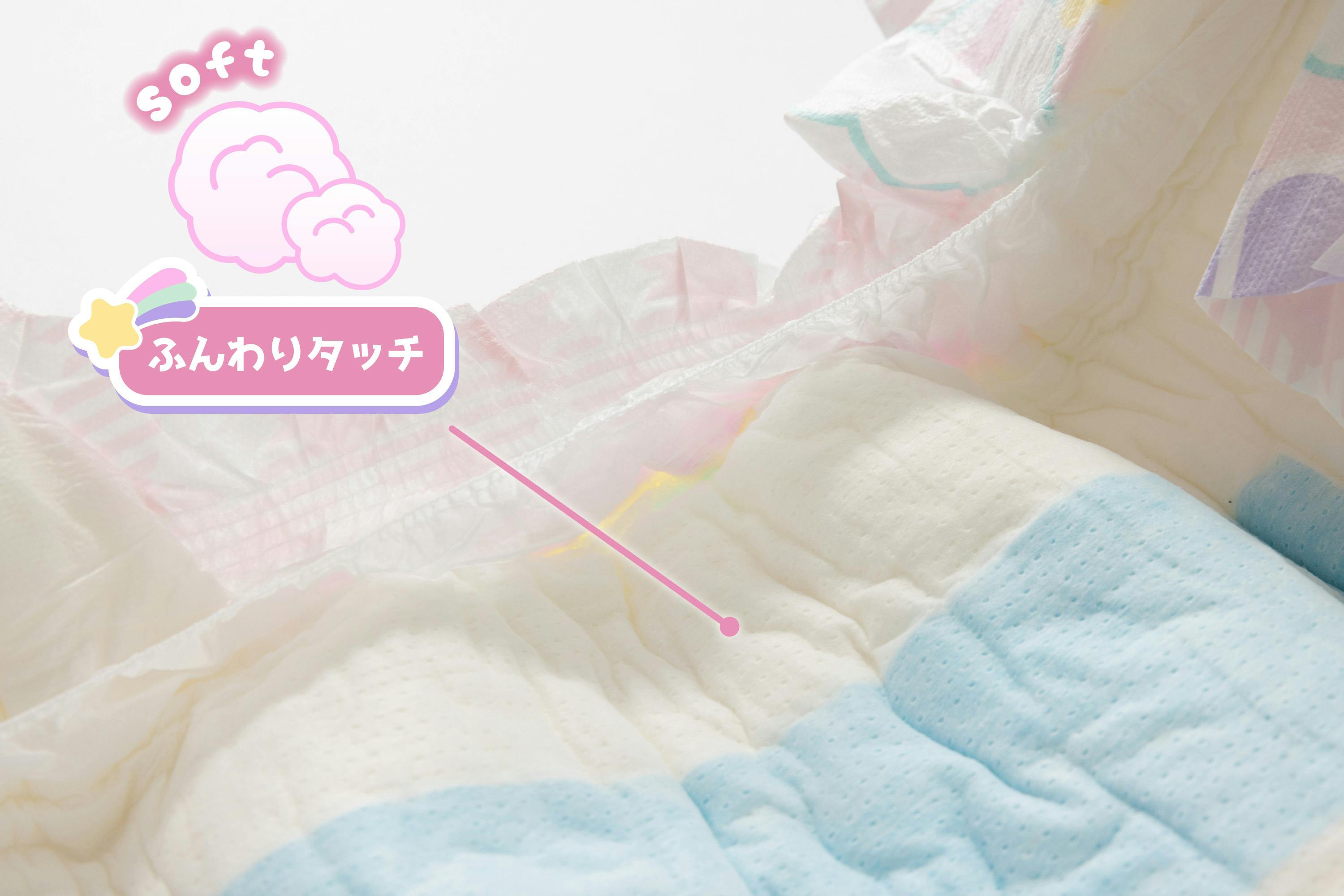 おむつのパッケージを手にした瞬間の「ワクワク感」や「心のときめき」を味わって頂くために、同じ空間にあるだけでも気分が上がるようなパッケージデザインに仕上げました。